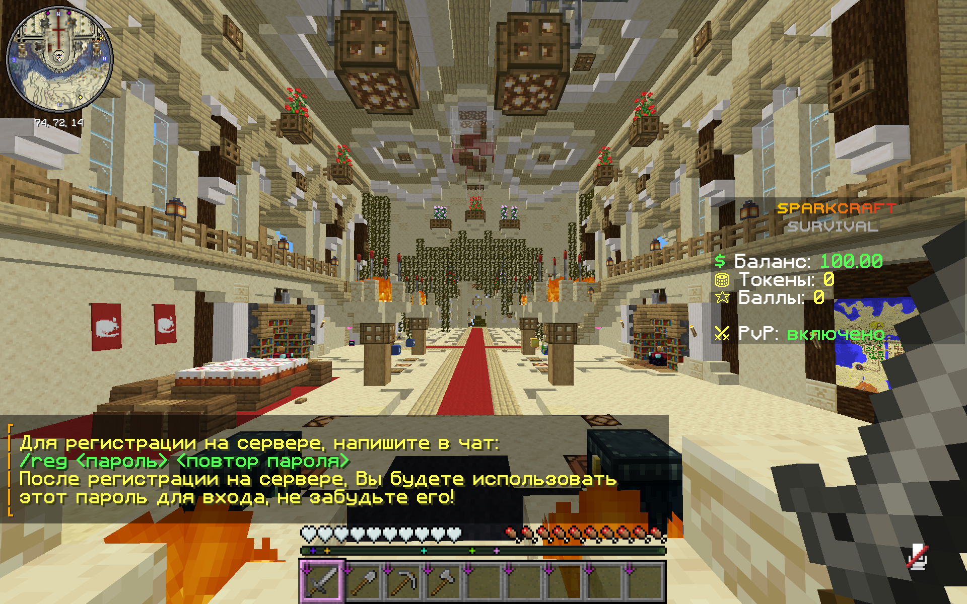 При первом заходе на сервер вам потребуется создать аккаунт. Введите в чат команду регистрации, указав пароль дважды для подтверждения. При следующих входах используйте команду авторизации с этим же паролем.
