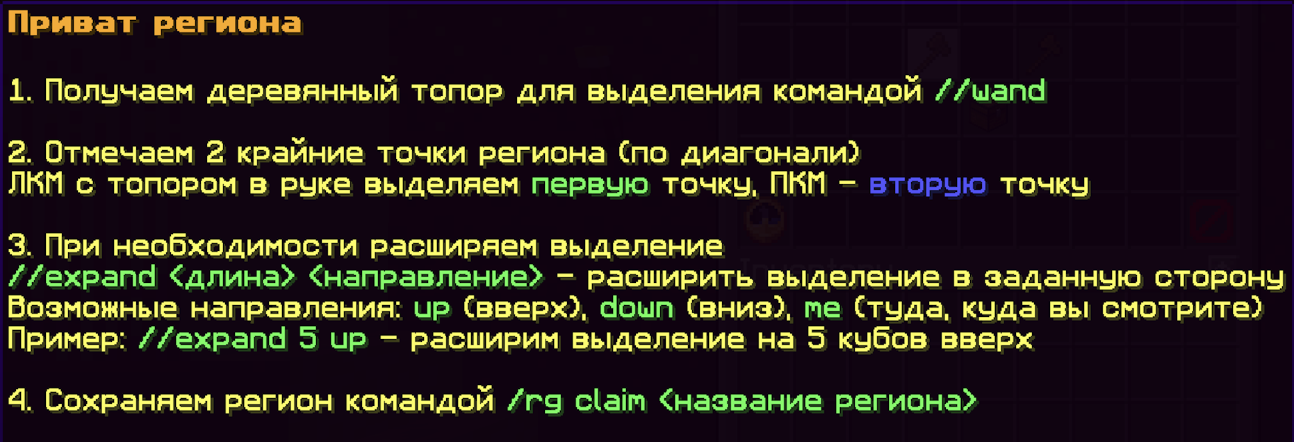 Чтобы создать регион, вам понадобится деревянный топор для выделения территории. Выделите два противоположных угла вашей будущей территории, а затем создайте регион командой.
