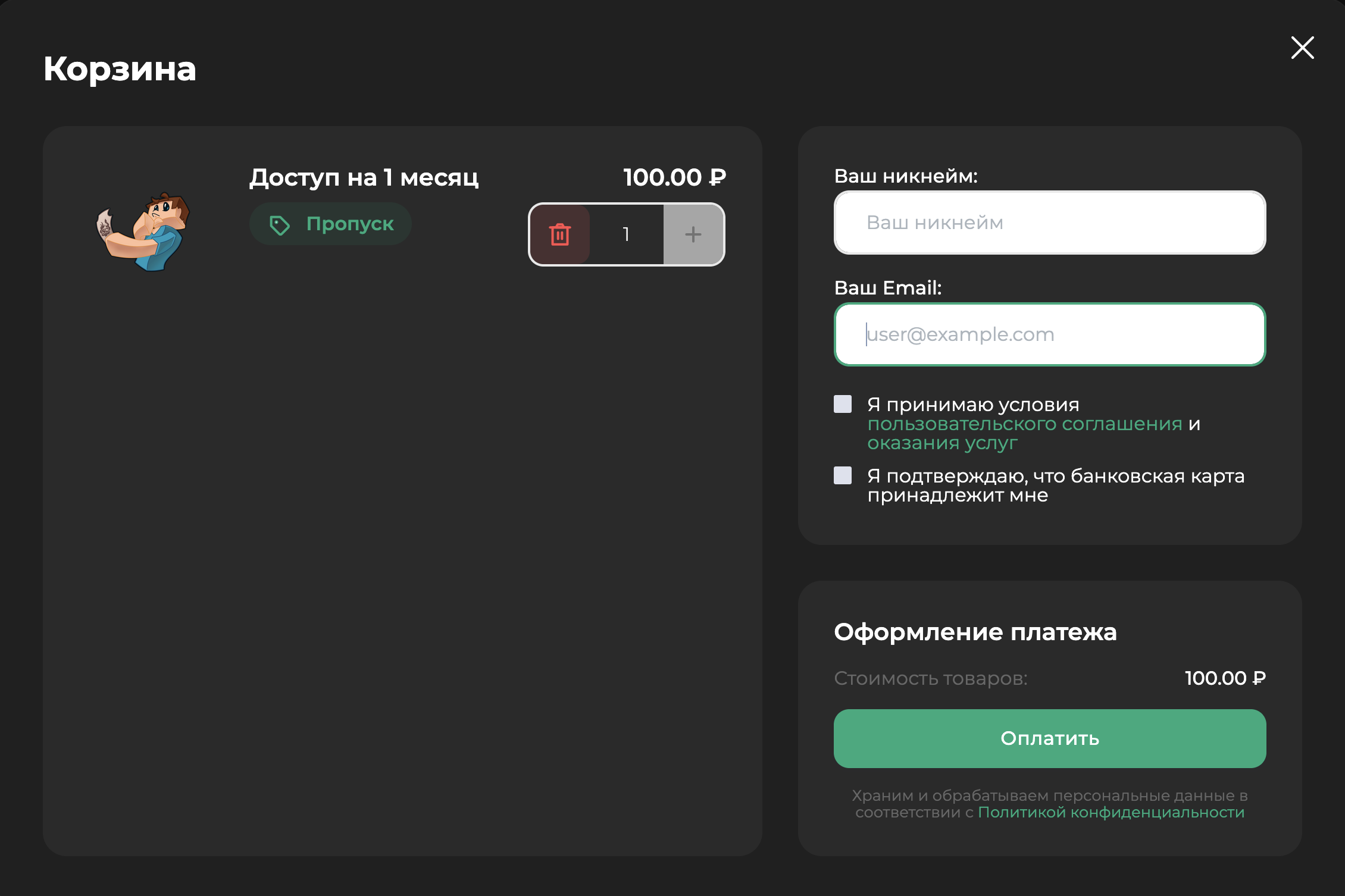 Для оплаты из-за рубежа используйте DonatePay или Boosty. Также можно оплатить через бота в нашем Telegram-канале. После покупки отправьте чек и никнейм на почту project.sparkcraft@gmail.com для выдачи пропуска.
